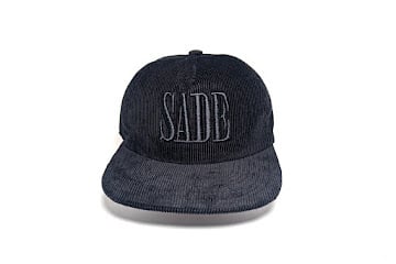 Materials are an obsidian polyester thread in puff format on an unstructured jet black 5 panel corduroy snapback.